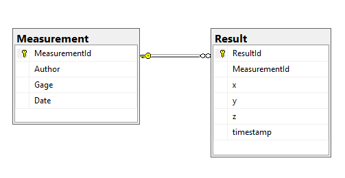 Tabela Result zawiera 3 serie wyników (x, y, z) wykonane w ramach pomiaru o identyfikatorze MeasurementId.